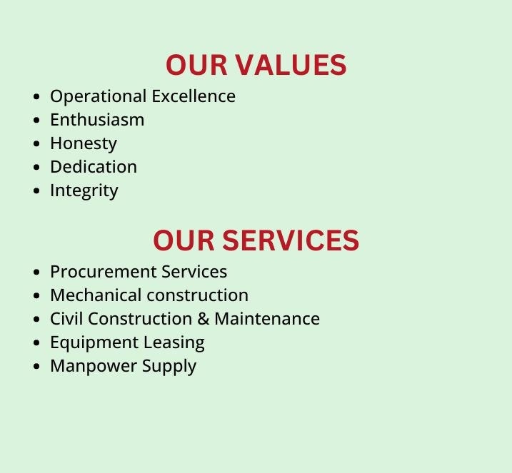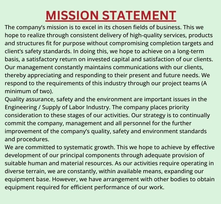 We cover a broad area of activities, which includes, but not limited to the following: Oil & Gas, Marine, Petrochemical, and Power and Civil construction industries. Our services cover the area of engineering procurement, mechanical & civil construction/ maintenance, equipment leasing and manpower provision. Our concept was founded upon the fact that companies require a dependable and reliable engineering support services provider that understands the significance of achieving company set targets on every project. We aim to achieve this by seeing ourselves as an extension of our client’s operations.