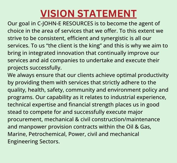 C-JOHN ENGINEERING PROJECTS LTD. (RC: 6860491) is a subsidiary of C-John-E Resources (RC: PH-069401) that was incorporated in Nigeria in October 30, 2002 under the company and Allied Matter Act of 1990. It started business shortly thereafter, servicing the private and public sector of Nigeria Economy. Our concept is to create and operate a dependable and reliable engineering support services that understands the significance of achieving company set targets on every job.